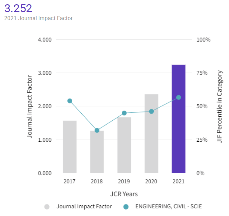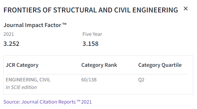2022年6月28日,科睿唯安公布的《2022年期刊引证报告》(JCR)最新数据显示,《Frontiers of Structural and Civil Engineering》(简称FSCE,中文名称《结构与土木工程前沿》)2021年影响因子为3.252,处于JCR Q2区,在SCIE土木工程类期刊排名第60/138位。