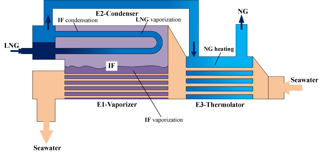关于IFV的研究,出发点均集中于提高换热性能、降低投资运行费用、提高设备安全性和方便与冷能利用结合等方面。学者们提出了新的IFV结构或部件配置,主要包括采用其他形式的高效换热器替代传统的管壳式换热器、增加泵组和液面防晃动板等辅助装置,以及根据运行工况适当省略E3换热器等;此外,对IFV系统进行了整体耦合热力计算和换热面积设计,并考虑实际因素的影响对热力计算模型进行修正;同时,寻找丙烷以外的制冷剂作为候选中间介质,主要是氟利昂类和烃类工质,通过热力模型比较并获得优选的制冷剂及其最佳工作状态。此外,有学者对中间介质始终处于过冷态的IFV系统进行了研究。针对LNG管内,有学者通过实验和数值模拟计算,研究超临界LNG气化过程的流动换热特性并开发了新的超临界甲烷管内气化换热关联式。