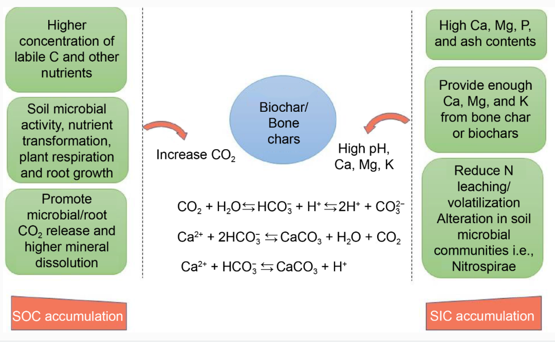 • 通过添加生物炭和骨炭恢复了土壤碱度,减少了无机碳的损失。