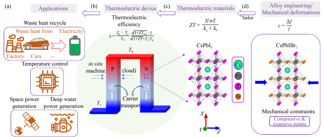 近年来,无机金属卤素钙钛矿材料由于集较低热导率和较高的载流子迁移率性质于一身而成为潜在的优异热电材料(图1(c-d))。本文研究者在前期研究(ACS Applied Materials and Interfaces, 2020, 12 (36), 40453-40464)中发现,通过相近离子半径的离子置换调控,可将钙钛矿材料转化为带隙可控的合金,该调控策略在显著提升材料稳定性的同时,也能直接有效地提升材料性能。本文进一步发现,通过机械形变调控可在热电器件中引入内应力,增强器件性能,为钙钛矿材料稳定性及热电性能的提升进一步开辟了新的技术途径。因此,本文针对无机钙钛矿卤族元素合金材料CsPb(I1-xBrx)3,开展了机械应变调控其电子结构及输运性能的研究,分析了钙钛矿基热电器件性能增强机理及电子/空穴传输的物理机制。通过本研究,可为钙钛矿及其他热电材料的输运性能调控及热电器件性能提升提供理论指导。