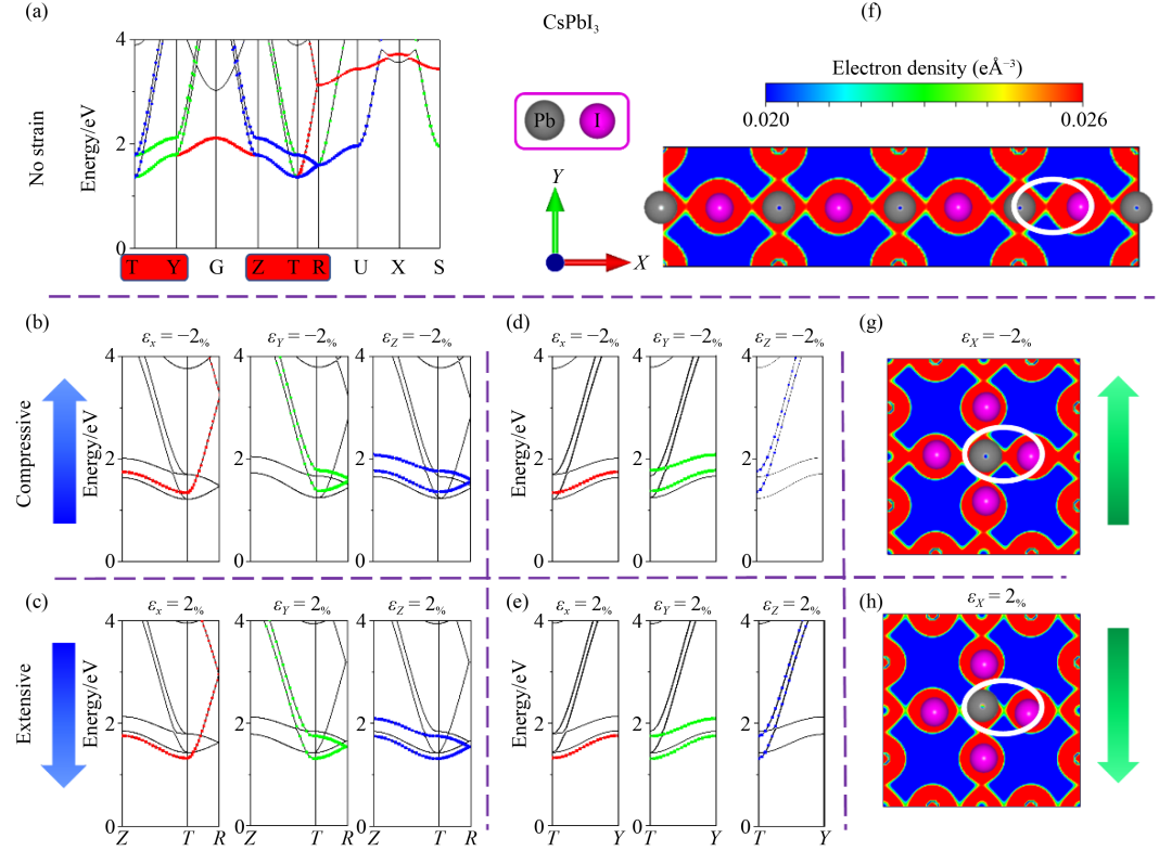 图2 CsPbI3在机械应变作用下电子结构及电荷密度变化。