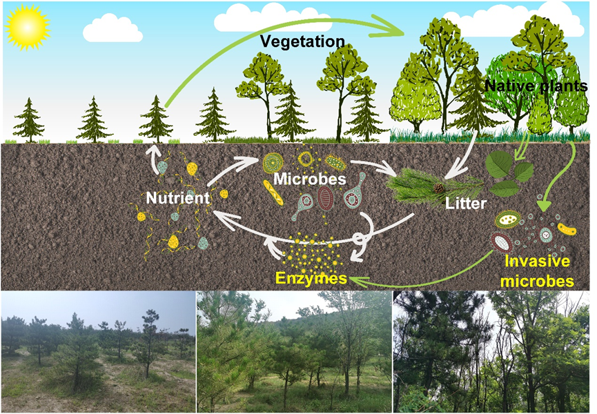 此外,本研究发现周边植被的入侵对人工油松林的次生演替类型具有重要影响。对于黄土高原地区而言,单一油松人工林并不利于生态系统的恢复,而本土植物和周边其他人工树种的入侵与扩散则对生态恢复具有积极作用,而其微生物通过酶介导并加速了次生演替进程。由植物入侵引发的次生演替差异造成了土壤微生物群落的显著差异,而且通过功能预测发现,与油松凋落物降解相关的酶功能基因EC 3.1.1.1(催化松柏醇脱氢的氧化还原酶)等也显著增加,而松柏醇被证明是难降解的木质素的重要前驱物之一。
