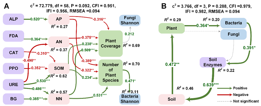 本研究在山西省安太堡露天矿区已恢复了30年的排土场中,选取了3个初始立地条件和恢复措施相似,处于不同次生演替进程的人工油松林,调查了土壤理化性质、酶活性、植被和微生物群落特征,并通过建立结构方程模型探索植物、土壤和微生物之间的相互关系,分析土壤微生物及其胞外酶在矿山排土场生态恢复过程中的作用。结果表明,次生演替造成不同人工油松林植被构型和土壤营养条件的显著差异,随着次生演替过程的推进,植物盖度由34.8%增加到95.5%,土壤有机质由9.30 g·kg-1增加到21.13 g·kg-1,全氮由0.38 g·kg-1增加到1.01 g·kg-1。土壤脲酶和β-葡萄糖苷酶活性分别提高了1.7倍和53.26%。此外,次生演替也改变了土壤微生物群落结构和功能。在硝化作用中占主导地位的硝化螺菌属(Nitrospira)的相对丰度增加了5.2倍。通过结构方程模型和土壤微生物群落功能预测发现,脲酶和β-葡萄糖苷酶能够通过促进土壤有机质和硝态氮的积累进而激发植被多样性和生物量增加。