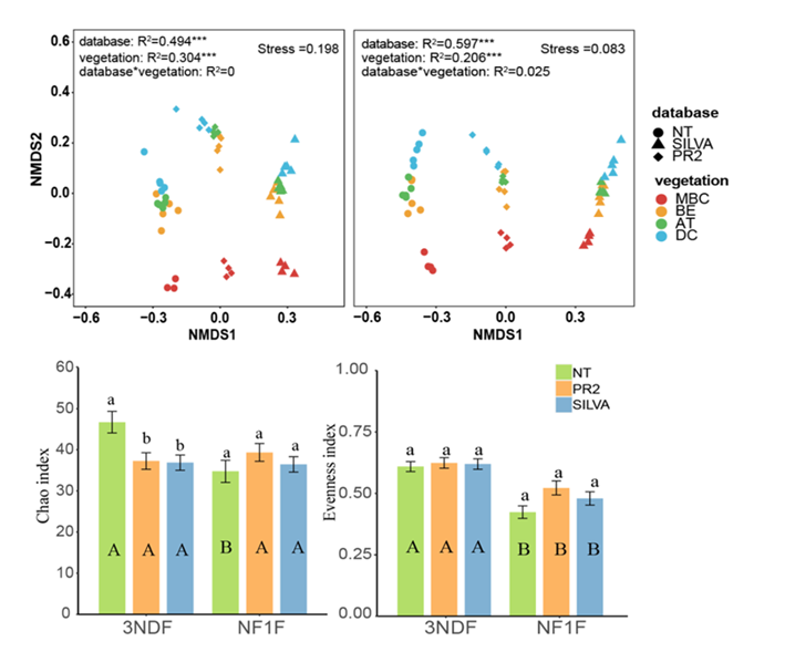 本研究依托中国科学院长白山森林生态系统研究站,选取针阔混交林、暗针叶林、岳桦林和苔原带四种植被类型,开展线虫引物(3NDf/C_1132rmod和NF1F/18Sr2bR) 和数据库(NT_v20200604、Silva138/18s 和PR2_v4.5数据库)的对比研究,试图探究不同的引物和数据库是否影响线虫群落组成的注释结果。研究表明:线虫群落组成的注释受到引物和数据库选择的影响,其中,3NDf引物在三个数据库中的注释在线虫属和种水平上差异明显;而NF1F引物在三个数据库中的注释只在科水平上表现出明显差异。随着线虫分类单元的逐步细化,三个数据库共享的类群也越来越少。在本研究中,3NDf引物和NT数据库结合的比对结果可以提供比其他组合更多的属或种水平的信息。