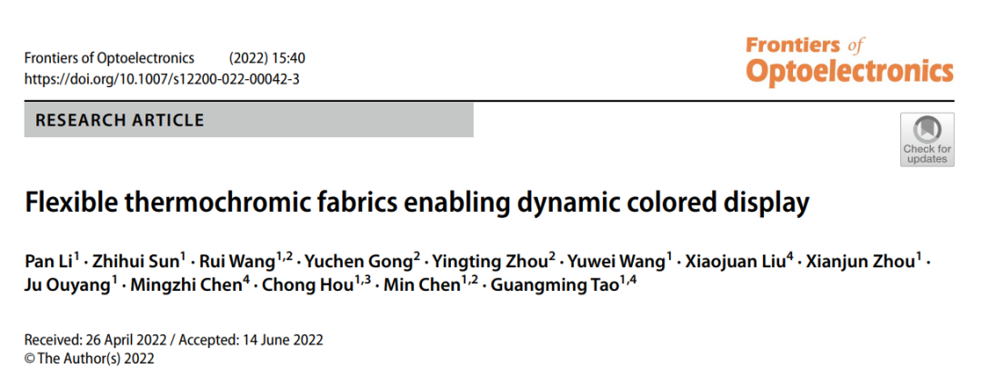 近期,华中科技大学的陶光明教授团队展示了一种基于湿法纺丝工艺大批量制备的颜色变化可逆的热致变色纤维,优异的机械特性及可编织性使其可用于制备彩色织物显示器件,并应用于柔性织物交互显示界面。相关工作以Flexible thermochromic fabrics enabling dynamic colored display为题于2022年9月29日发表在Frontiers of Optoelectronics期刊上。