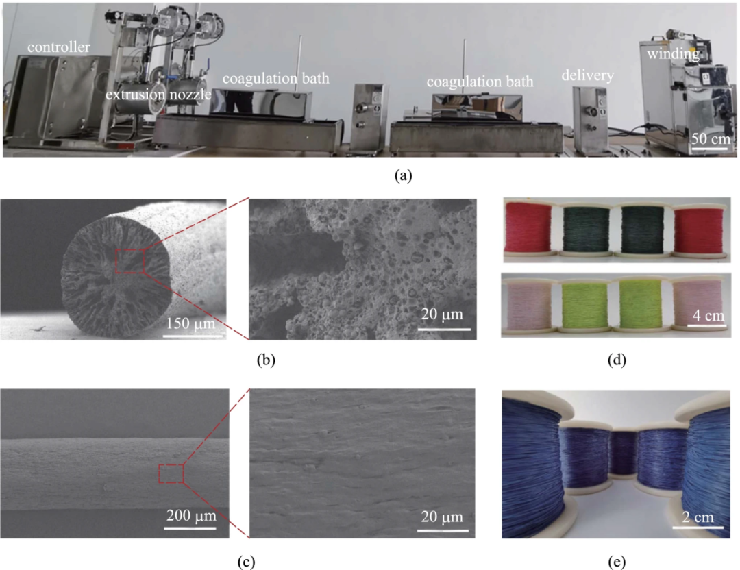 图2 热致变色纤维的制造和结构表征。a 用于大批量生产热致变色纤维的纺丝装置。b 热致变色纤维横截面图。c 热致变色纤维表面形态图。d-e 多色系热致变色纤维实物照片以及大批量制备热致变色纤维的实物照片