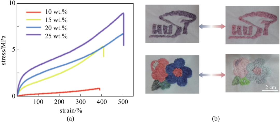 图3 热致变色纤维的性能。a 热致变色纤维中TPU含量从10 wt.%增加到25 wt.%时的应力/应变曲线。b 不同编织图案(“HUST”和一朵花)在温度变化时发生的颜色变化(比例尺:2 cm)