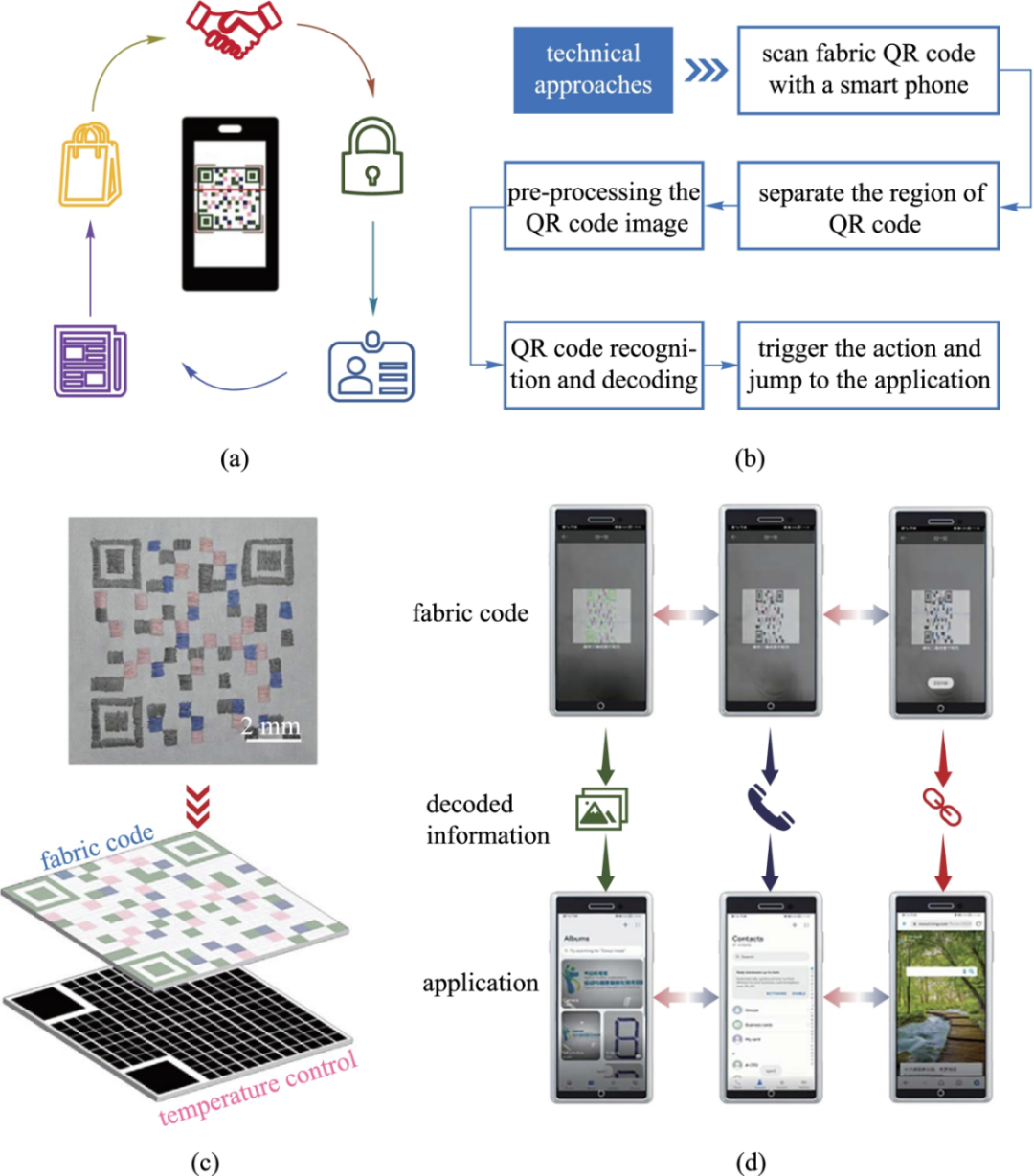图4 基于热致变色织物彩色二维码的信息交互。a 织物二维码的各种可能的应用场景。b 织物二维码识别的基本流程。c 织物二维码的加热方案示意图。d 从三种彩色织物二维码图案中获得的不同信息