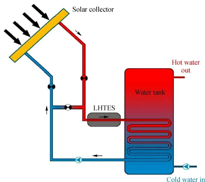 最后讨论了基于Gr的相变材料在太阳能领域的应用。太阳能热电厂中的Gr基相变材料和Gr涂层利用蒸汽的直接产生和简单的再热朗肯循环来储存热能,由于相变材料中存在导热系数非常高的Gr,可以显著缩短充放电时间。集中式太阳能热电厂的示意图如图2所示。另外还有太阳能热水系统中基于Gr的相变材料,太阳能热水器在白天收集太阳能加热热水,Gr基相变材料吸收热能并储存。在夜间,从基于GR的相变材料中回收热能来加热水。原理图如图3所示。除此之外还讨论了基于Gr的相变材料在太阳能温室、建筑、电池热管理系统、电子散热和热能储存方面的应用。