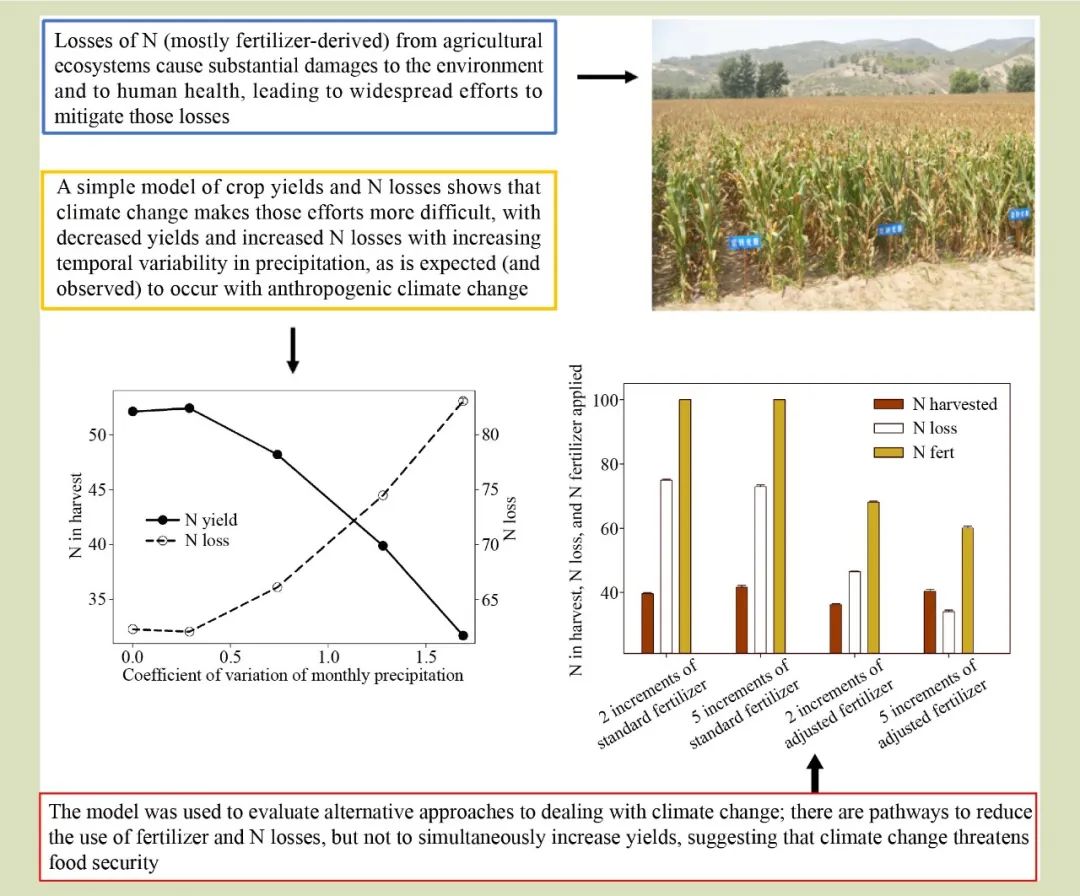 本文使用了一个关于生产力和氮磷循环的“TOY”模型,用以评估气候变化驱动的降水时间变异性增强如何影响作物产量和活性氮损失,从而导致生态环境破坏并威胁人类健康。该模型预测,随着降水时间变异性的增强,将扰乱氮素供应和植物氮素吸收之间的同步性,逐渐减少产量并增加活性氮的损失。此外,降水时间变异增加了洪涝和干旱的发生频率。该模型预测表明,在雨养农业生态系统中,随着气候变化驱动的降水变异性逐渐增强,将使部分集约化种植体系难以同时维持较高的产量和较低的环境及人类健康足迹。