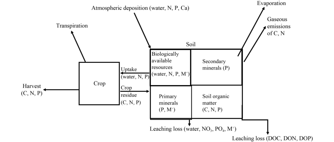 TOY模型主要基于模拟的土壤水分、温度及所有来源的生物有效氮和磷(肥料、大气沉降和土壤有机氮和磷以及氮和磷的矿化)来计算非固氮作物的生产力。