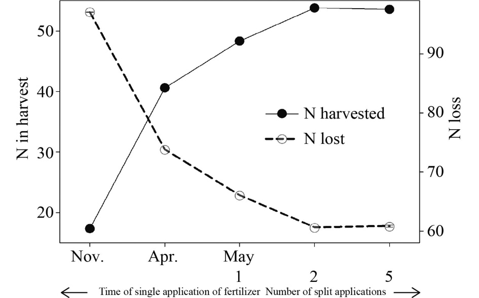图2 模拟施用肥料的时间(x轴左侧)和模拟分次施用肥料的次数(x轴右侧)对收获材料中氮的回收(实线,产量的代表)和活性氮通过淋溶和气体通量损失到环境中(虚线)的影响