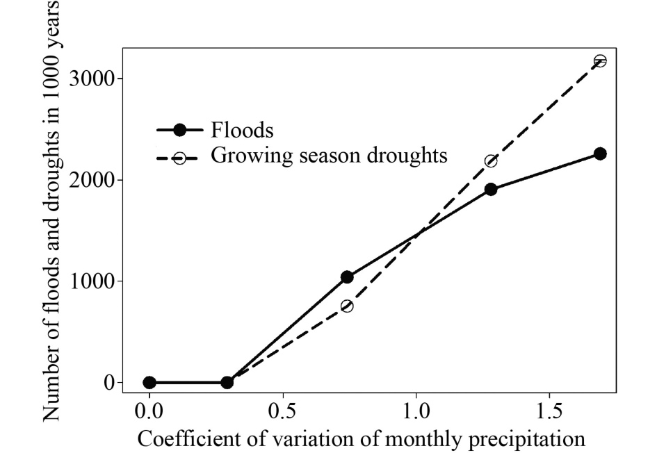 通过降水时间变异的五种强度模拟研究,发现降水时间变异性的增强会导致作物产量下降,活性氮的损失逐渐增大,洪涝和干旱的发生(仅在生长季节)更加频繁(图3)。
