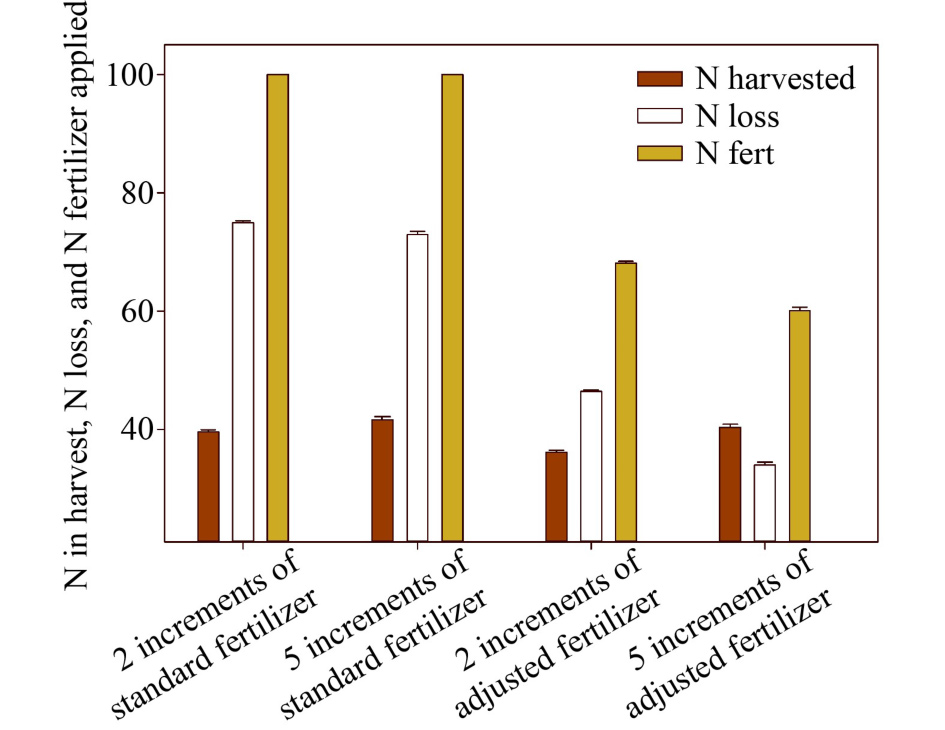 当地施用肥料(分别为100和20单位的氮和磷)可提高作物产量和减少活性氮损失;当肥料在作物种植和开始生长时单次施用添加,可在作物中收获近一半的氮施肥量(48.8%)(图2)。当施肥发生在接近作物生长季节开始时,活性氮的损失急剧下降。将肥料分次施用,其中的40%在作物生长季节的第一个月施用,另60%在两个月后施用,作物收获后氮回收量进一步增加(达到施用氮的53.6%),活性氮的模拟损失进一步减少(图2)。