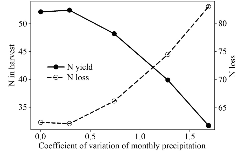 氮既是集约农业的重要资源,也是破坏环境和威胁人类健康的原因。在集约化农业系统中,大量的氮被收获的作物带走,然而氮的流动性将使剩余的氮以多种形式进入大气和水体,当可用的氮超过作物需求时,氮就很容易损失。当施氮量超过作物需求时,会造成肥料氮损失增加。降水变异性将直接影响作物施肥的时机,使得肥料养分供应和作物需求之间不匹配。降水变异性增强可导致氮素供应与氮素需求之间的不同步,间接造成更多的氮损失。关于降水和人为温室气体驱动的此类气候变化,较为可靠的预测之一是:降水变异性将随着地球变暖而增强。本文重点关注,降水时间变异性的增强是否会增加氮的损失,从而使作物对氮的需求与氮的供应更难同步。