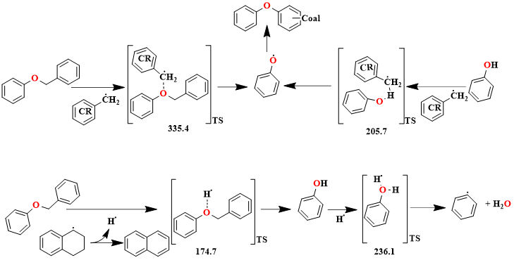 图1 煤热解自由基传递对含氧官能团转化的机理(CR:煤热解自由基碎片;TS:过渡态,数值表示能垒,kJ/mol,450 °C)