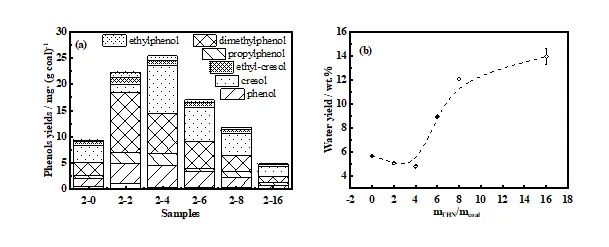图4 煤直接液化产物中酚类化合物的收率(a)和水产率(b),450 °C