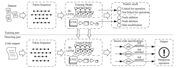 帮助程序员检查大量源代码中的危险操作,通过静态分析将源代码模糊地解析为令牌序列,然后通过神经网络模型提取这些令牌之间的关系,来识别链表的操作是否符合安全规范,包括节点的增加、节点的删除、节点数据的赋值或修改。并解决了以下问题:
