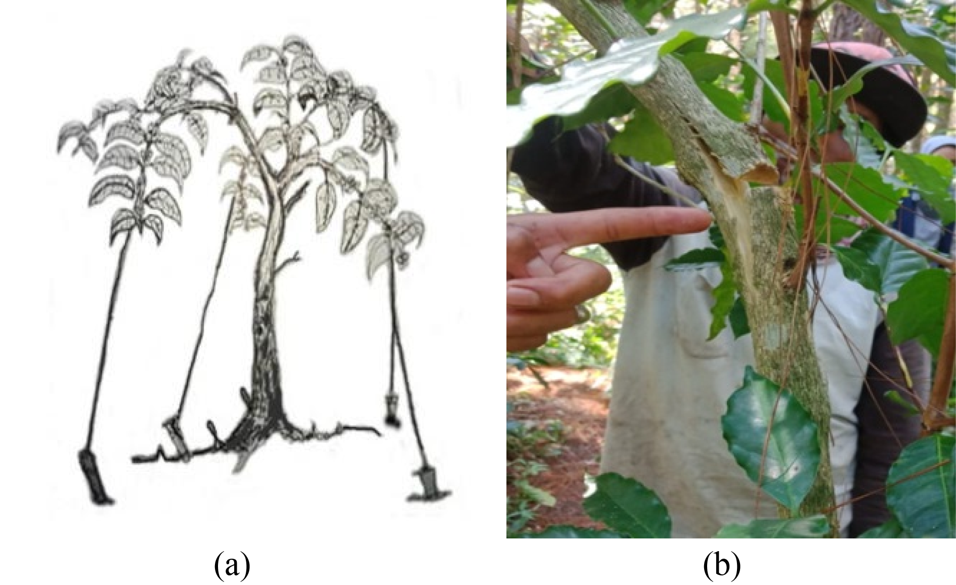 2.在以松树为基础的农林复合系统中,通过弯曲树枝以增加咖啡产量。