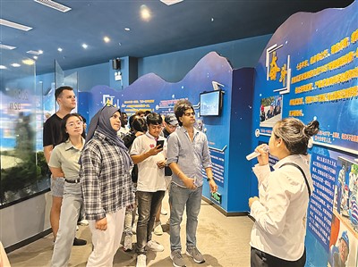 在自然、城市、人口、经济、文化和方志编修等展厅,国际学生们驻足在藏品、图表和影像前,听解说员娓娓道来北京的古老和年轻。