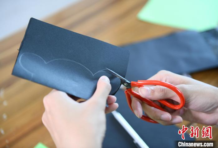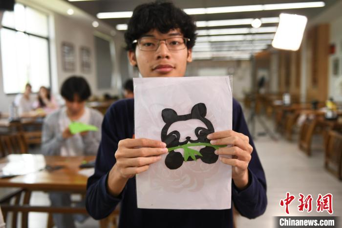 当天,记者在现场看到,留学生们在老师的引导下,通过折纸、画图、剪纸等步骤,将黑色的纸剪成大熊猫图案,再将绿色的纸剪成竹子图案,最终制作成大熊猫吃竹子图案的剪纸作品。