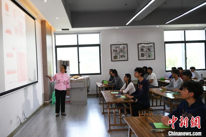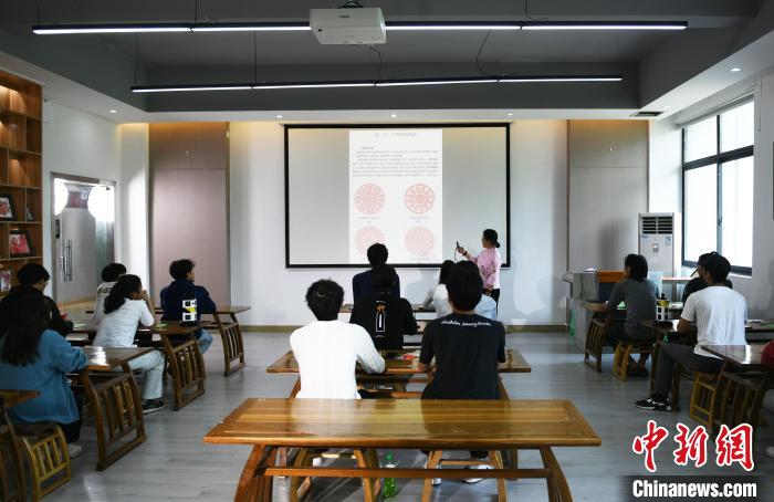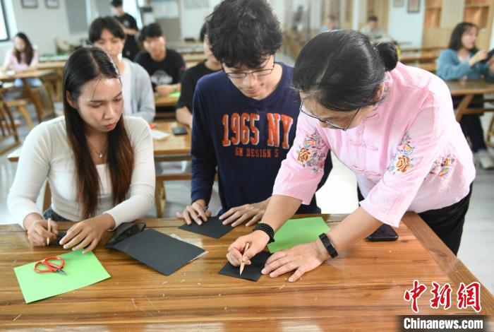 图为剪纸技艺课堂上,老师教留学生在纸上画图。中新网记者 周毅 摄