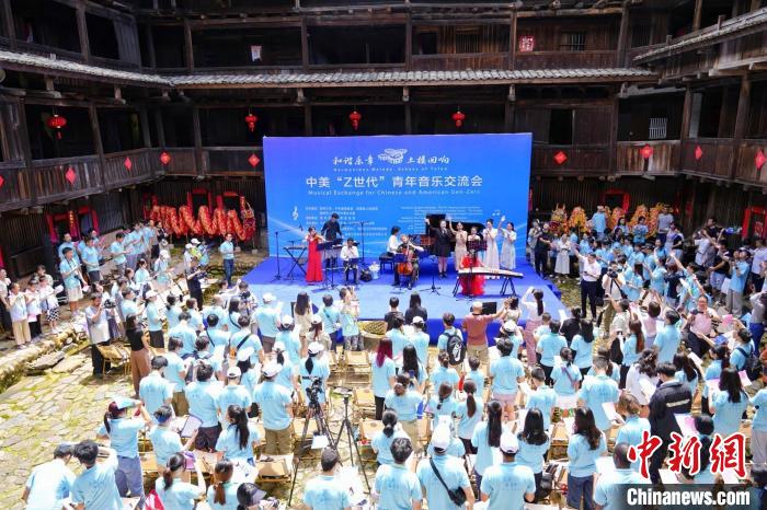 当天上午,“2024福建中美青年交流营”活动之“和谐乐章土楼回响——中美‘Z世代’青年音乐交流会”在南靖县田中赋景区举行。近百名美国青少年与230多名中国学生、南靖艺术爱好者开展交流互动。