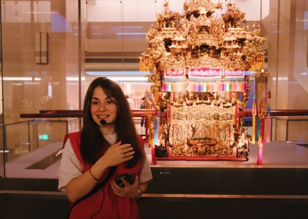 “大家了解中国以前的婚礼吗?眼前这个轿子,是给新娘子坐的,用作结婚的花轿,就像现代超长的婚车……”上海市历史博物馆,志愿者定时导览服务的时间到了,来自阿尔巴尼亚的留学生陆海燕站在“物华号百子大礼轿”前,用流利的中文向观众们讲解这件镇馆之宝,讲述这件文物的前世今生。