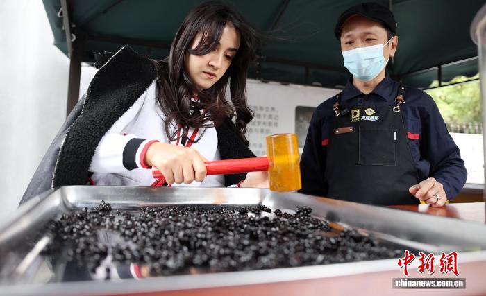 11月27日,中阿卫视主持人、记者阿思玛体验兴隆华侨传统炭烧咖啡焙炒技艺。陈英清 摄