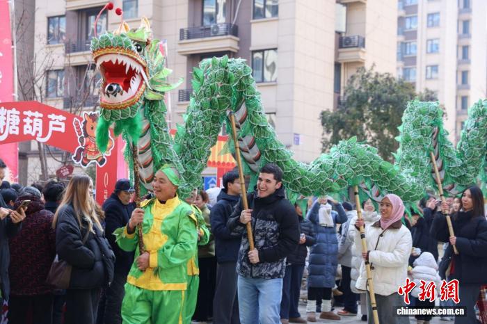 “洋学生”舞起桑叶龙,体验新春年俗。赵宁 摄