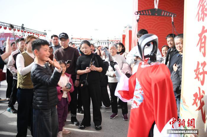 2月22日,“乐购新春·福满超级皖”主题活动在合肥骆岗中央公园启幕。图为小朋友与身着戏服的机器人互动。中新社记者 赵强 摄