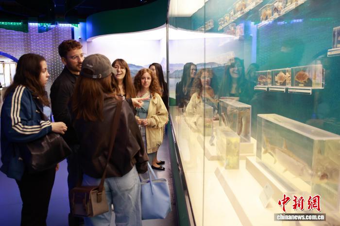 4月12日,留学生在位于浙江丽水青田的稻鱼共生系统博物馆驻足观看瓯江水生生物标本。孙杨洋 摄