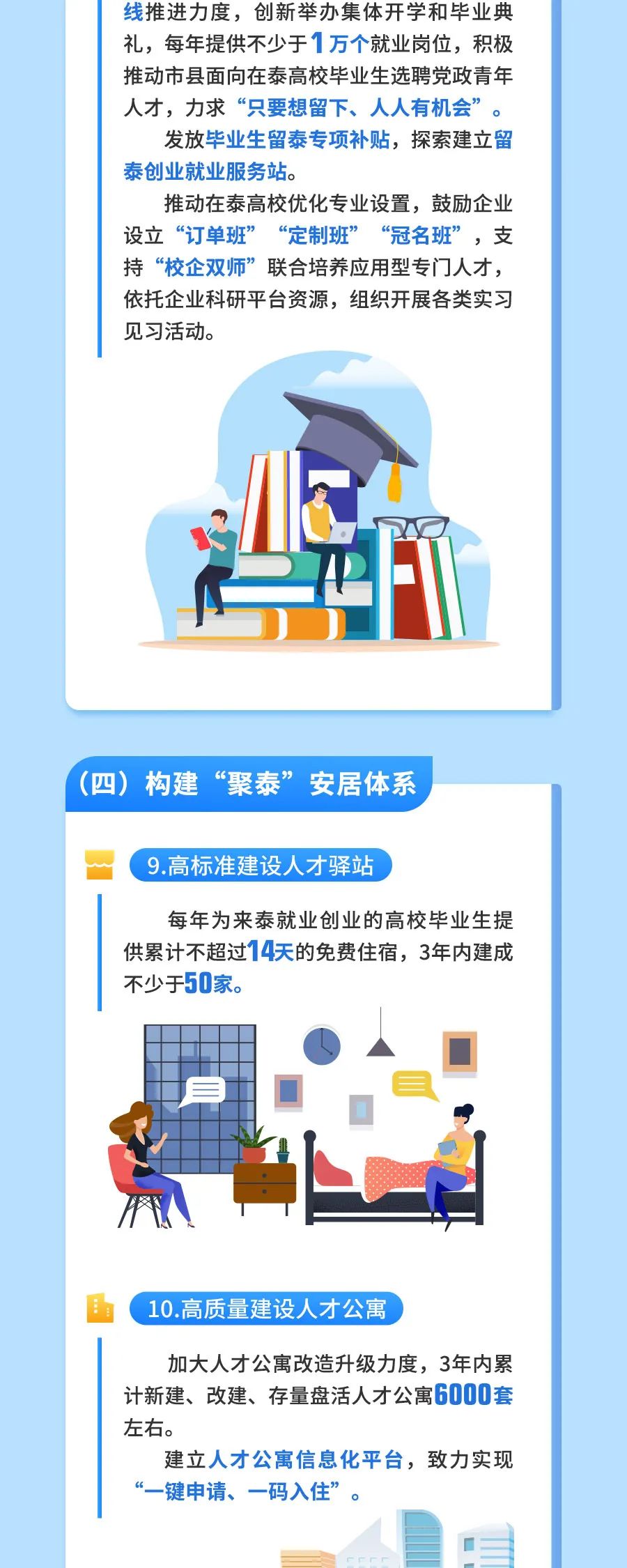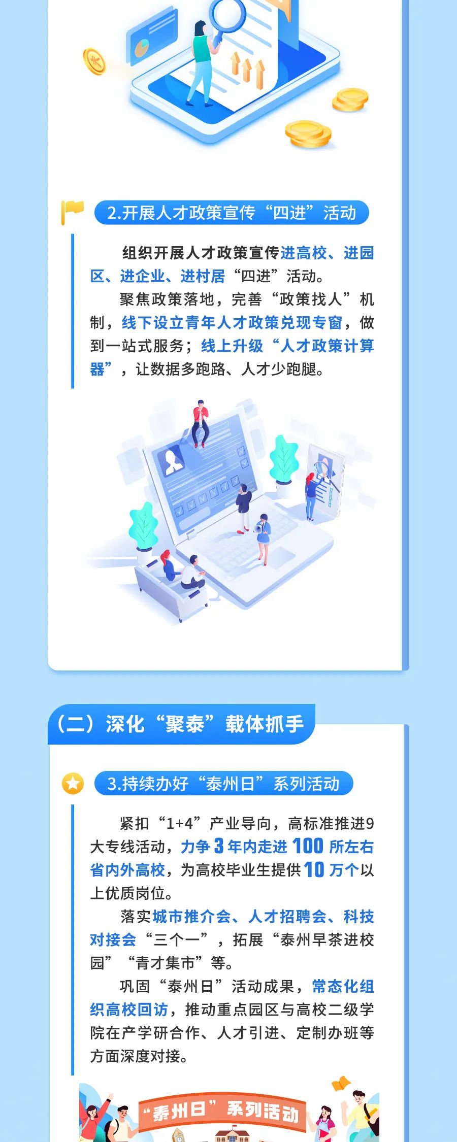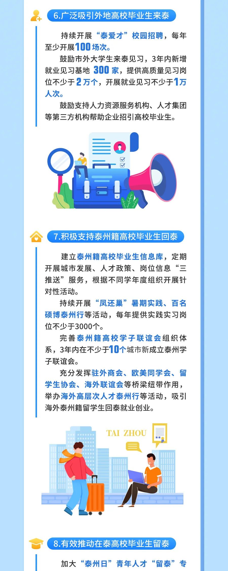 8月31日,全市青年和人才友好型城市建设大会隆重召开,会上发布了《青年人才“聚泰”三年行动计划》,围绕高校毕业生来泰、回泰、留泰落实系列推进措施,力争3年新增15万人。具体内容如下,一图读懂↓↓↓