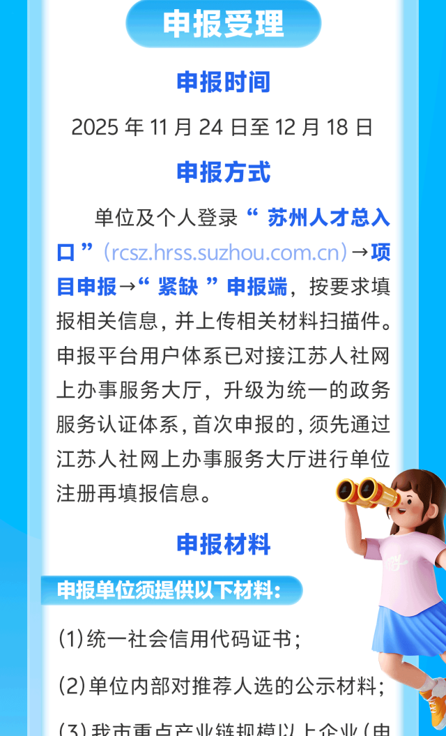 近日,苏州市委人才办、市人社局、市工信局、市商务局联合印发《关于组织申报2025年苏州市重点产业紧缺人才计划的通知》(苏人保开〔2025〕8号),符合条件的申请对象可进行申报。