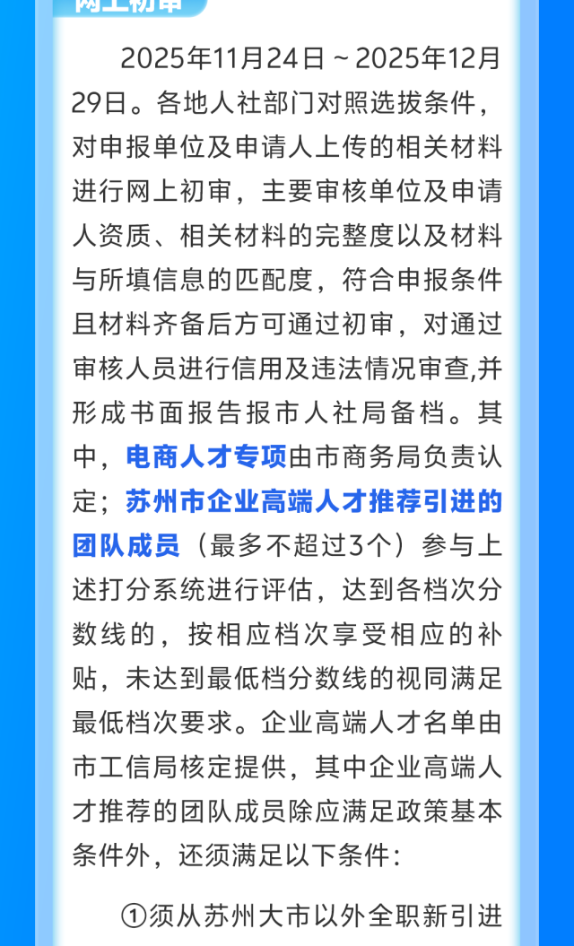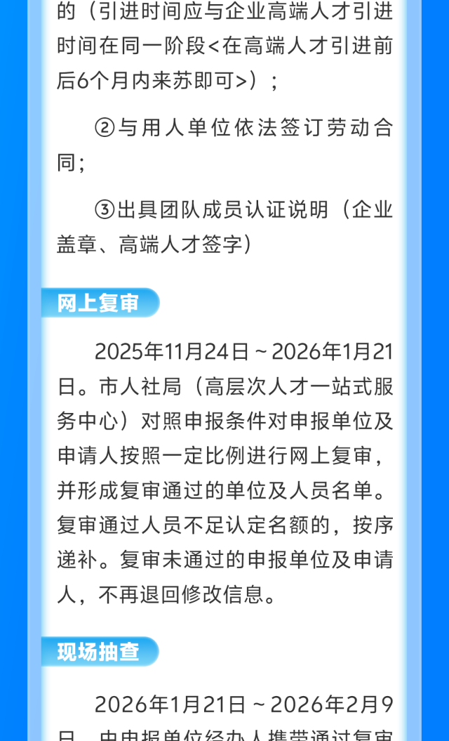 (1)须从苏州大市以外全职新引进的(引进时间应与企业高端人才引进时间在同一阶段<在高端人才引进前后6个月内来苏即可>);