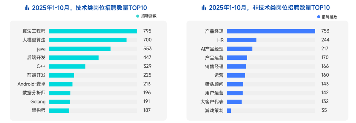 2025年1-10⽉,AI岗位断层领跑热招岗位榜。在热招的TOP10技术岗中,算法⼯程师与⼤模型算法分列第⼀位、第⼆位。这两个岗位也是面向应届生招聘数量最多的岗位。在热招的TOP10⾮技术类岗位中,产品经理、HR分列一二位。AI产品经理位列第三。