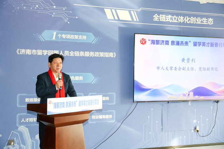 黄贵利在致辞中表示,海外英才到济南创新创业,可谓恰逢其时、正当其势,天时、地利、人和,一切都刚刚好!他向广大英才发出邀约,赶紧来,省会济南这里有难得的机遇等你来点燃,来此播种希望定能长成令人惊叹的模样。济南战略定位高、机遇叠加,拥有十大发展优势,特别是市委、市政府将2026年确定为“项目赋能年”,正处发展黄金期,诚邀留学英才关注济南、选择济南,在此绽放芳华、成就理想。大胆闯,省会济南这里有广阔的舞台等你来施展,来此创新创造定能收获令人意想不到的成果。济南产业基础雄厚、科创平台高能,四大主导产业规模迈向2万亿元,科创资源密集、创新活力强劲,为留学人才提供广阔舞台,助力创新创造收获丰硕成果。扎下根,省会济南这里有优良的生态等你来体验,来此深根立业定能收获一生无怨无悔的抉择。济南人才政策暖心、服务一流,构建“天下泉城,人来无忧”全生命周期人才服务体系,类海外环境持续优化,人才发展生态优良,将全力为人才保驾护航,让大家安心工作、舒心生活,无悔扎根济南。