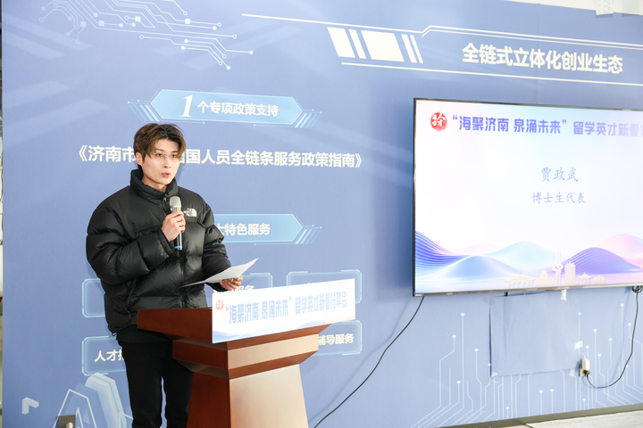 会上,现场播放了《我在济南刚刚好》2025济南城市人才宣传片及主题曲MV;为留学生青年人才作了人才和金融服务政策解读;留学服务企业代表侯双喆,优秀留学人才代表香港城市大学城市设计专业博士研究生贾政武、英国布里斯托大学数学专业硕士研究生宋若冰,分享了他们的逐梦故事;市委组织部副部长、市委人才办常务副主任王玉跃为青年人才代表颁发“济南市双招双引大使”聘书;留学生代表美国南加利福尼亚大学硕士研究生林泽宇宣读《“海聚济南 泉涌未来”致全市广大留学青年的倡议书》。