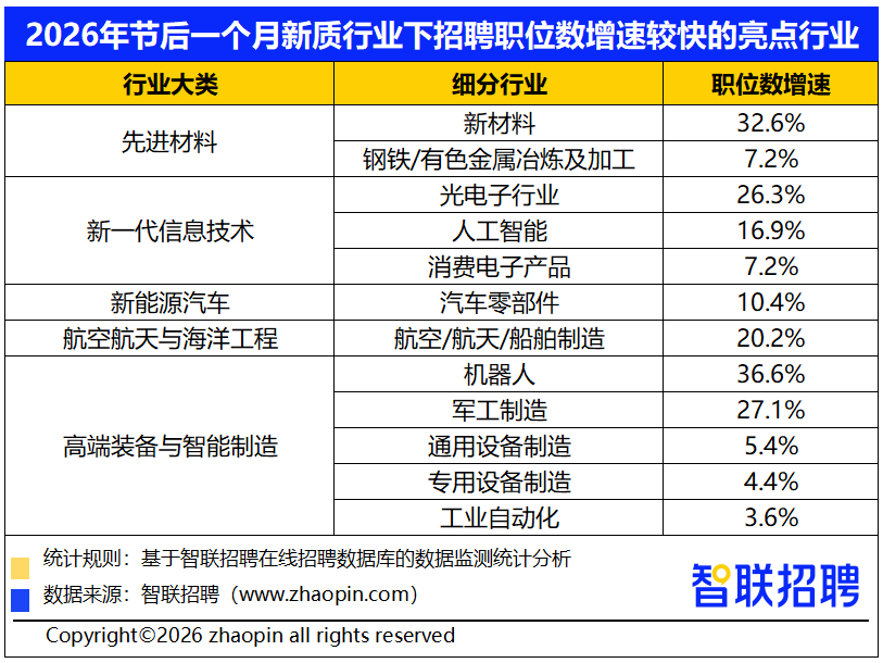 新质产业人才需求持续升温,机器人、新材料成核心增长极。数据显示,2026年春节后一个月,8大新质生产力行业中,先进材料、新一代信息技术、新能源汽车等技术密集型行业职位数同比增速突出,成为人才吸纳主阵地。其中,高端装备与智能制造领域受制造端自动化改造推动,工业机器人渗透度快速提升,节后一个月职位数同比增长36.6%,军工制造行业同比增长27.1%,增速领跑全行业。
