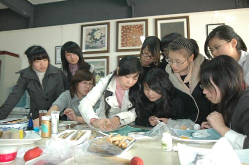 ![]() 浙江工贸职业技术学院艺术专业学生在浙江创意园艺术创意工作室研讨瓯塑作品。 邱开金 摄